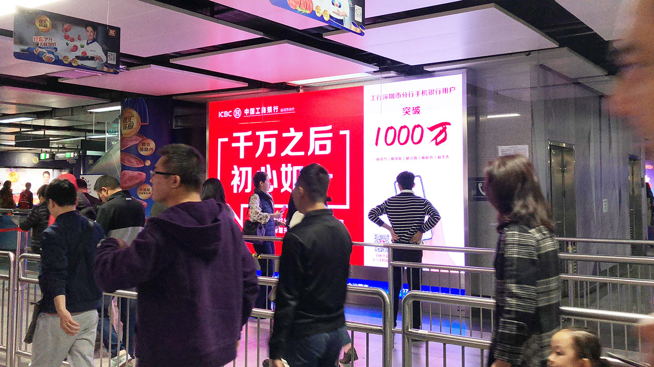 千万之后,初心如一,工行深圳市分行与深圳虎童科技合作,通过虎童科技运营的深圳地铁4号线大屏媒体的独家资源,向广大用户展示运用大数据、生物识别和语音交互技术等最新前沿科技打造的移动银行。