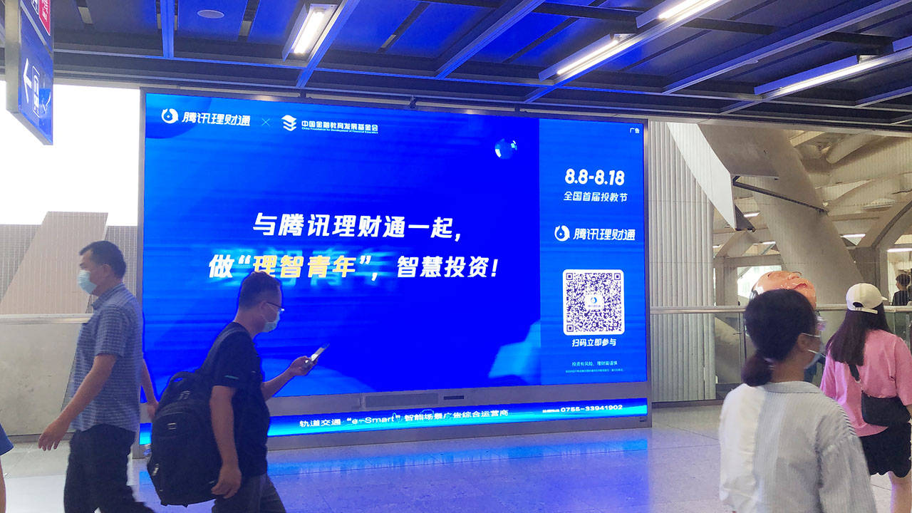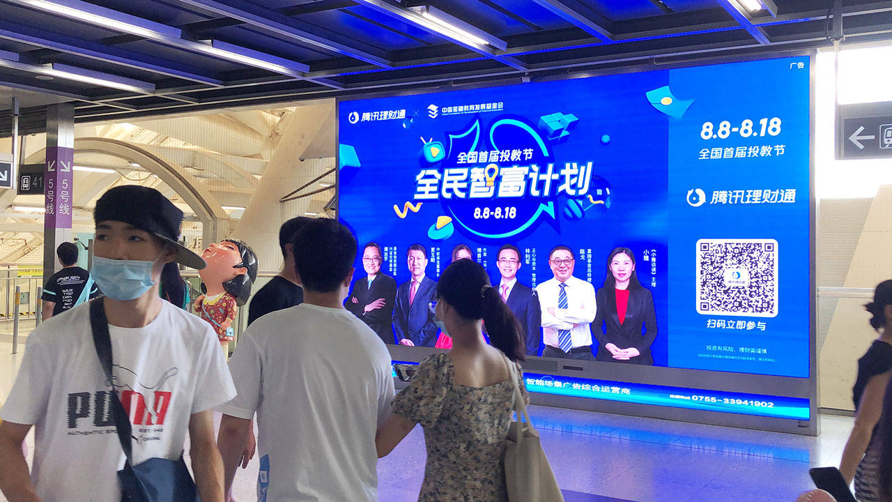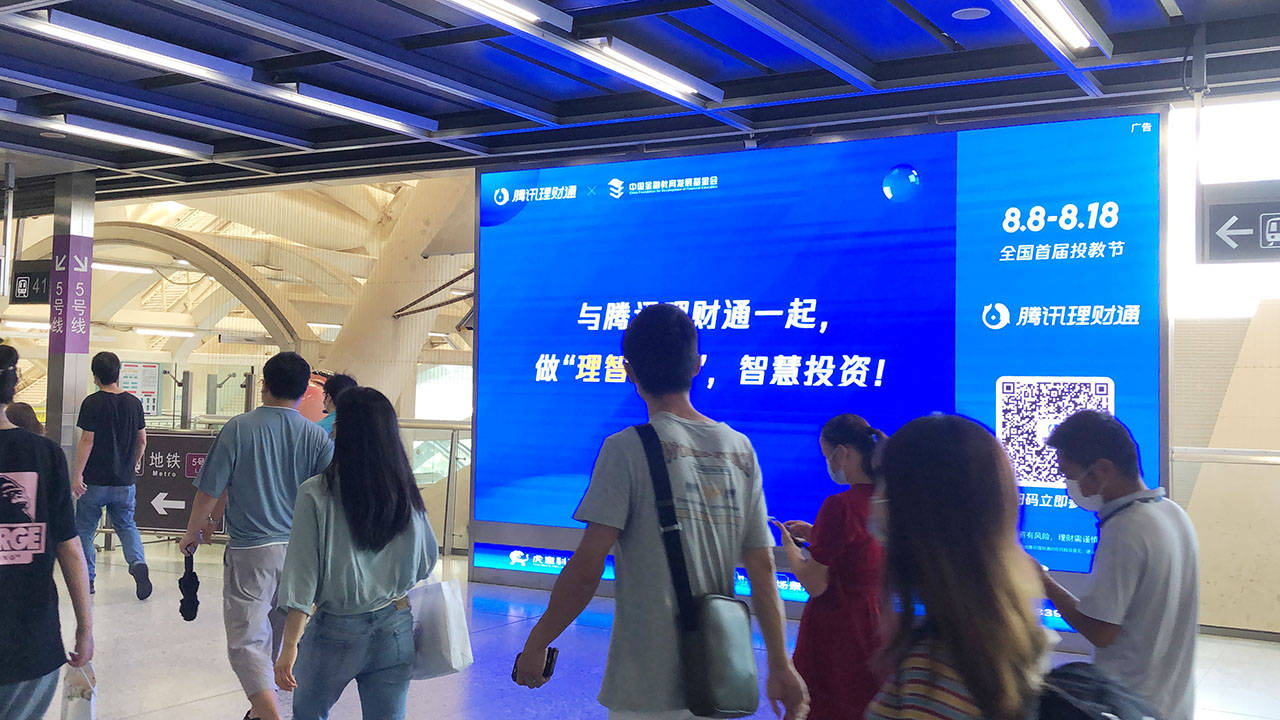 深圳虎童科技地铁大屏媒体携手腾讯理财通,为提升民众的金融基础知识,树立正确的投资风险认知,传达理性的投资理念助力。